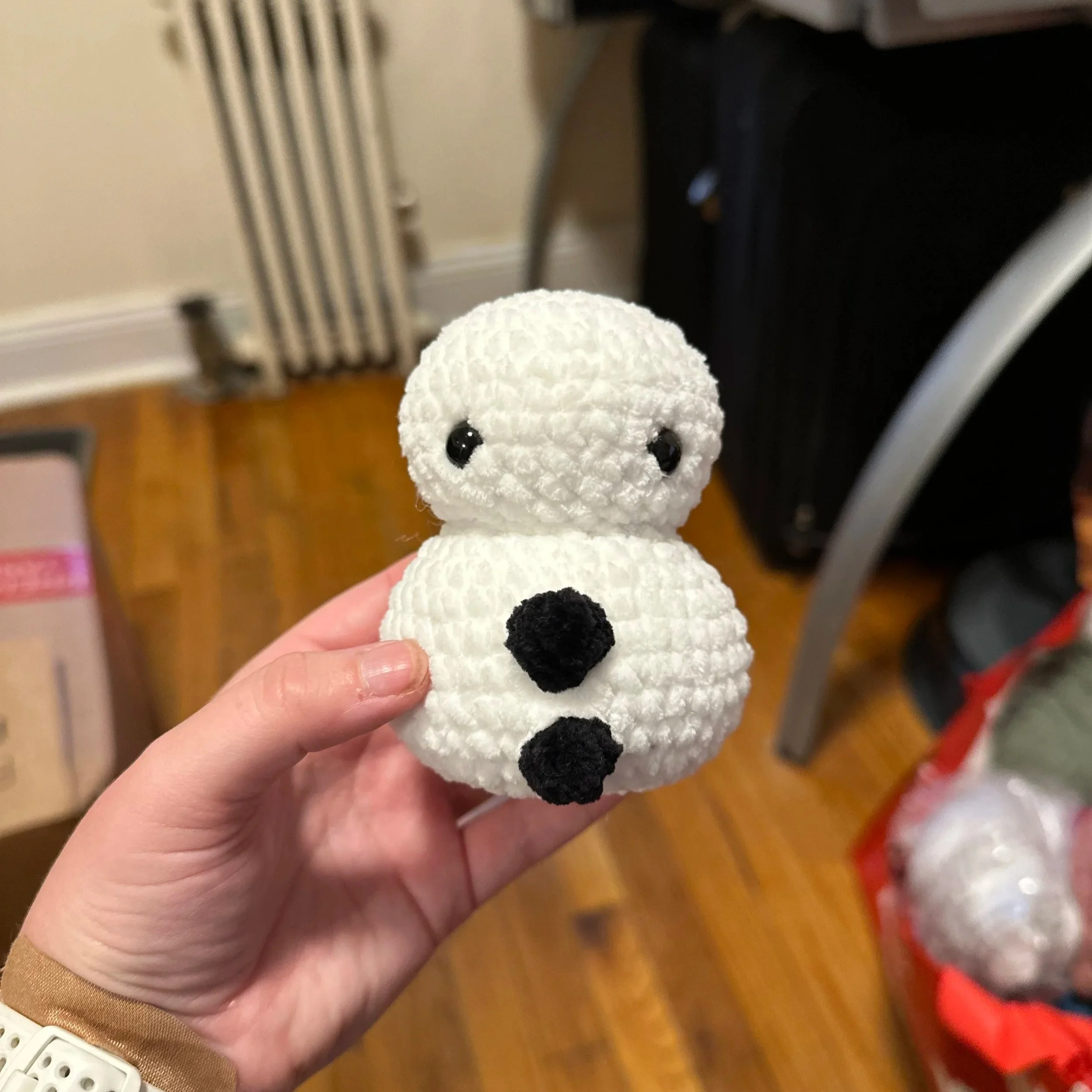 For the scarf, use your color of choice. Ch 37, or however long you’d like your scarf to be. FO and then tie the scarf around the snowman’s neck, making sure to thread in between the tail and the body.